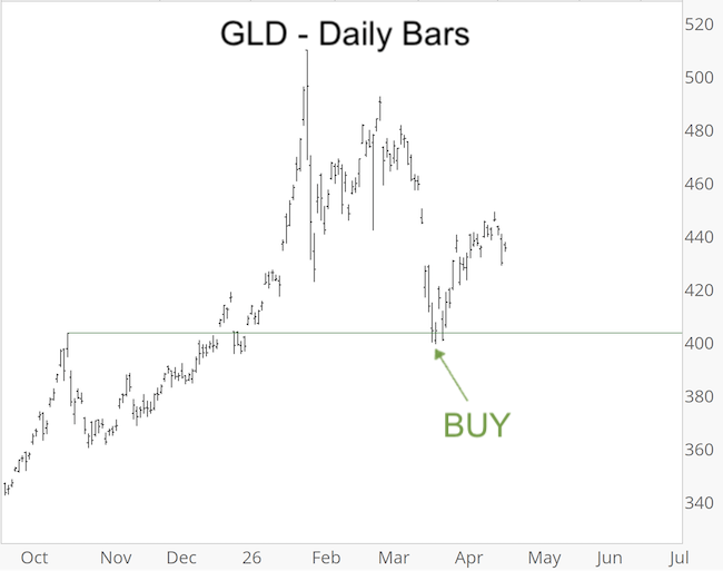 This drop happened shortly thereafter and the Profit Radar Report recommended to buy GLD below 400. The March 25 Profit Radar Report explained why: