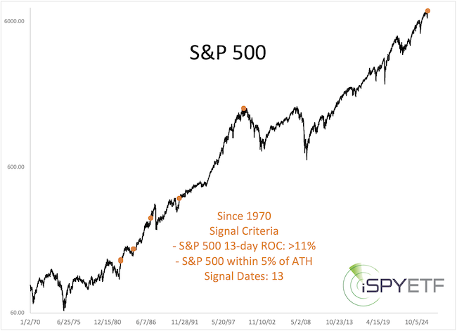 However, quick pops that carry the index to new all-time highs are very rare. There are only 12 other times (since 1970) when the S&P rallied more than 11% in a 13-day period (ROC-13) and those 12 signals dates are confined to 5 clusters.