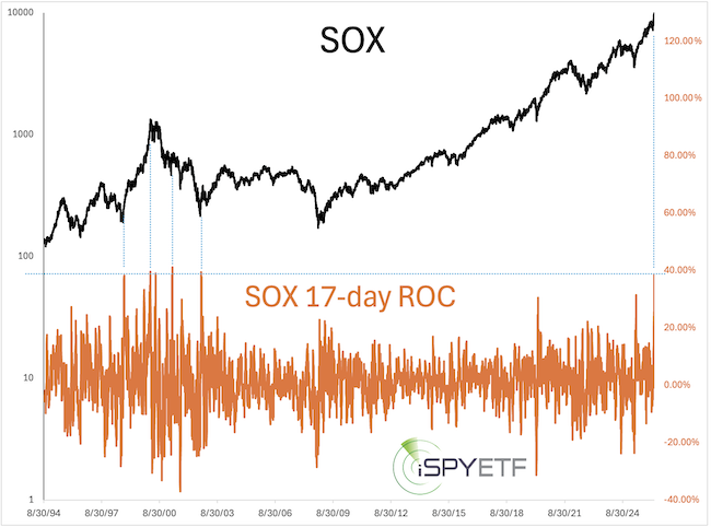 The SOX (Philadelphia Semiconductor Index) rallied 38.74% in the 17 days since the March low. There have only been 4 other times when SOX rallied as much as quickly. The dashed blue lines below highlight those instances.