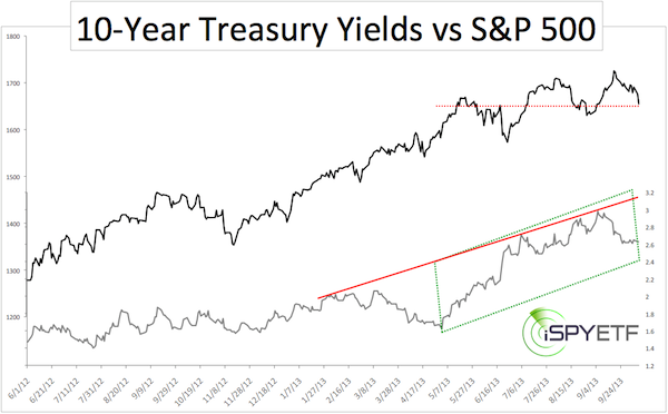 The 10-year yield nearly doubled since May. The 7-10 Year Treasury Bond ETF (NYSEArca: IEF) dropped as much as 10%, a huge move for Treasury Bonds. The iShares Barclays 20+ Treasury Bond (NYSEArca: TLT) fell as much as 16%.